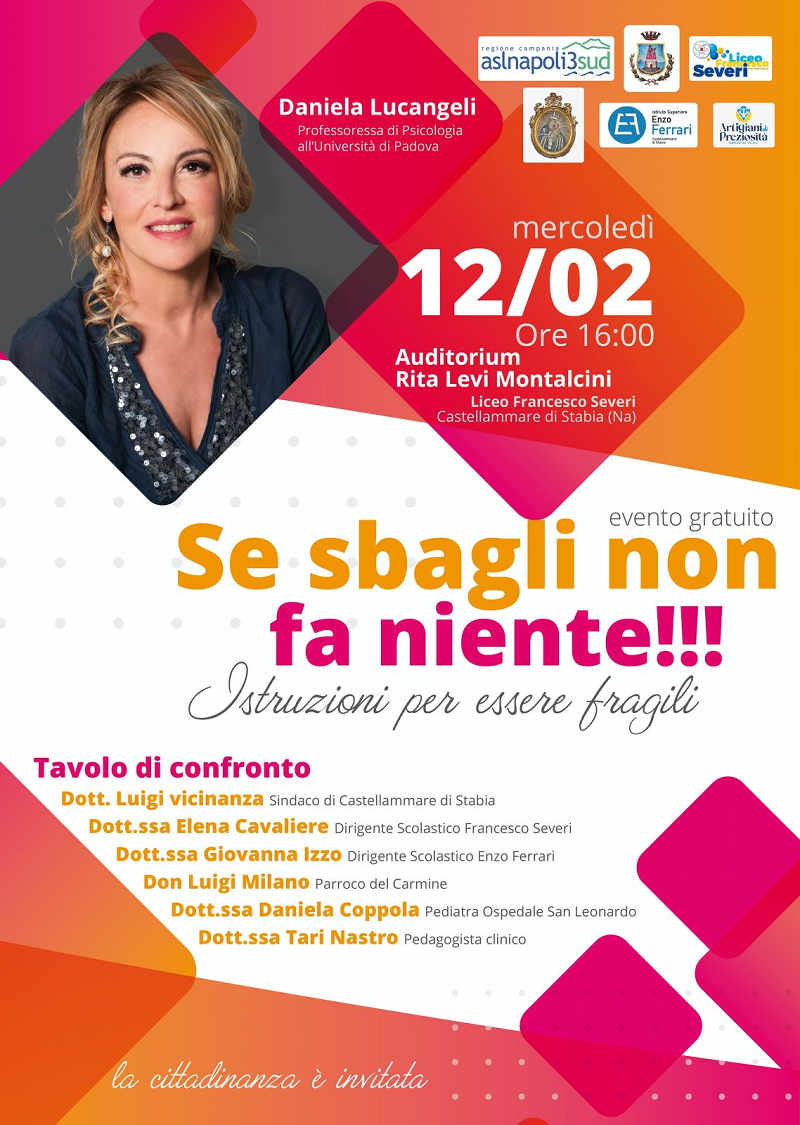 Segnalo già nella tua agenda!!! Con il patrocinio morale dell'ASL Napoli3Sud e del Comune di Castellammare di Stabia Mercoledì 12 FEBBRAIO ore 16.00 presso l'auditorium Rita Levi Montalcini, Liceo Francesco Saveri Castellammare di Stabia “Se sbagli non fa niente!!! Istruzioni per essere fragili”. Daremo il…